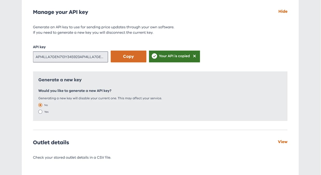 Generate an API key. This unique code will allow you to access our API, and will let us know who is sending us data. From here you’ll need to integrate this API key with your fuel price changing software. If you don’t know how to do this, contact your in-house IT professional or 3rd party software vendor.