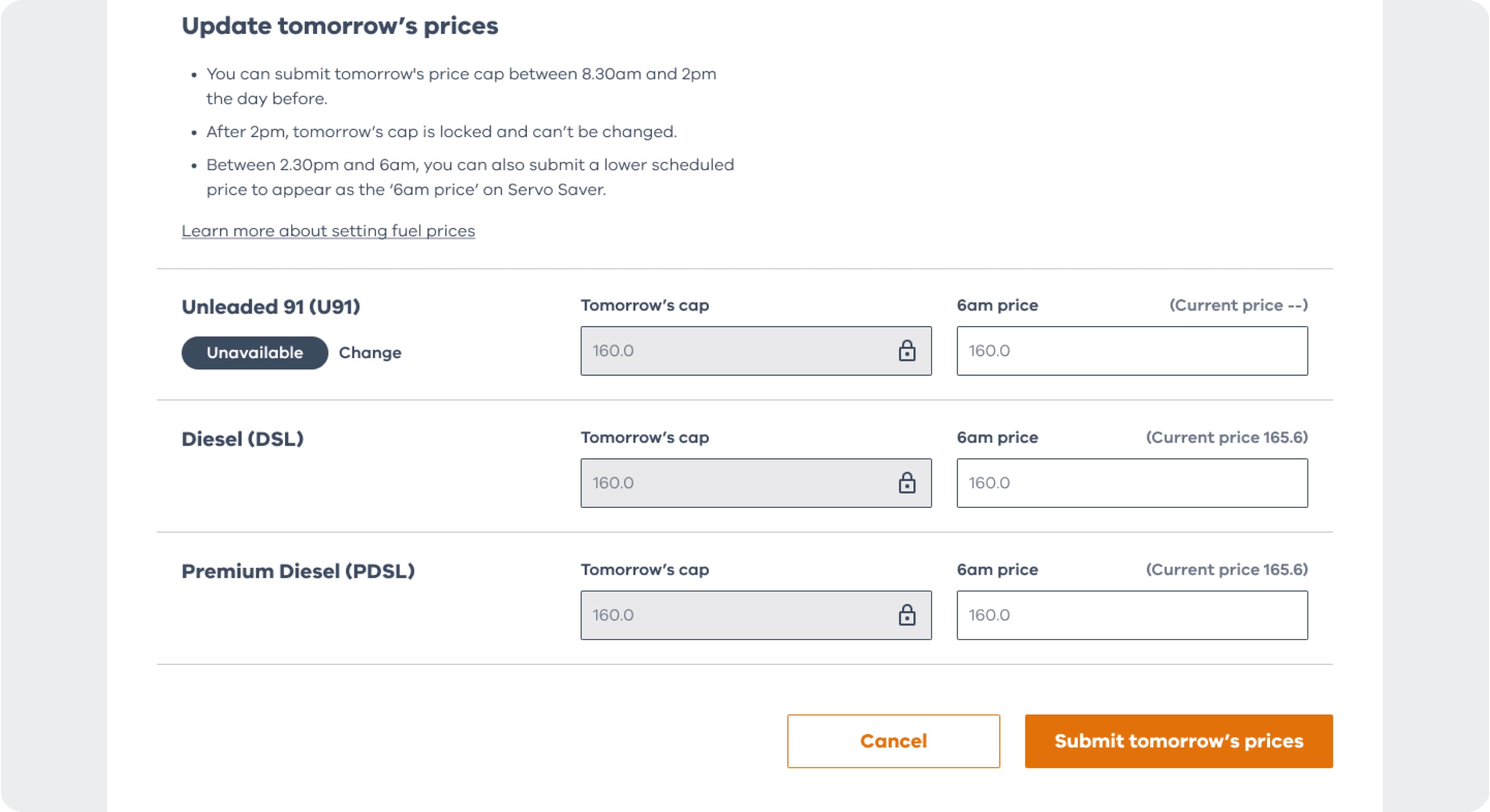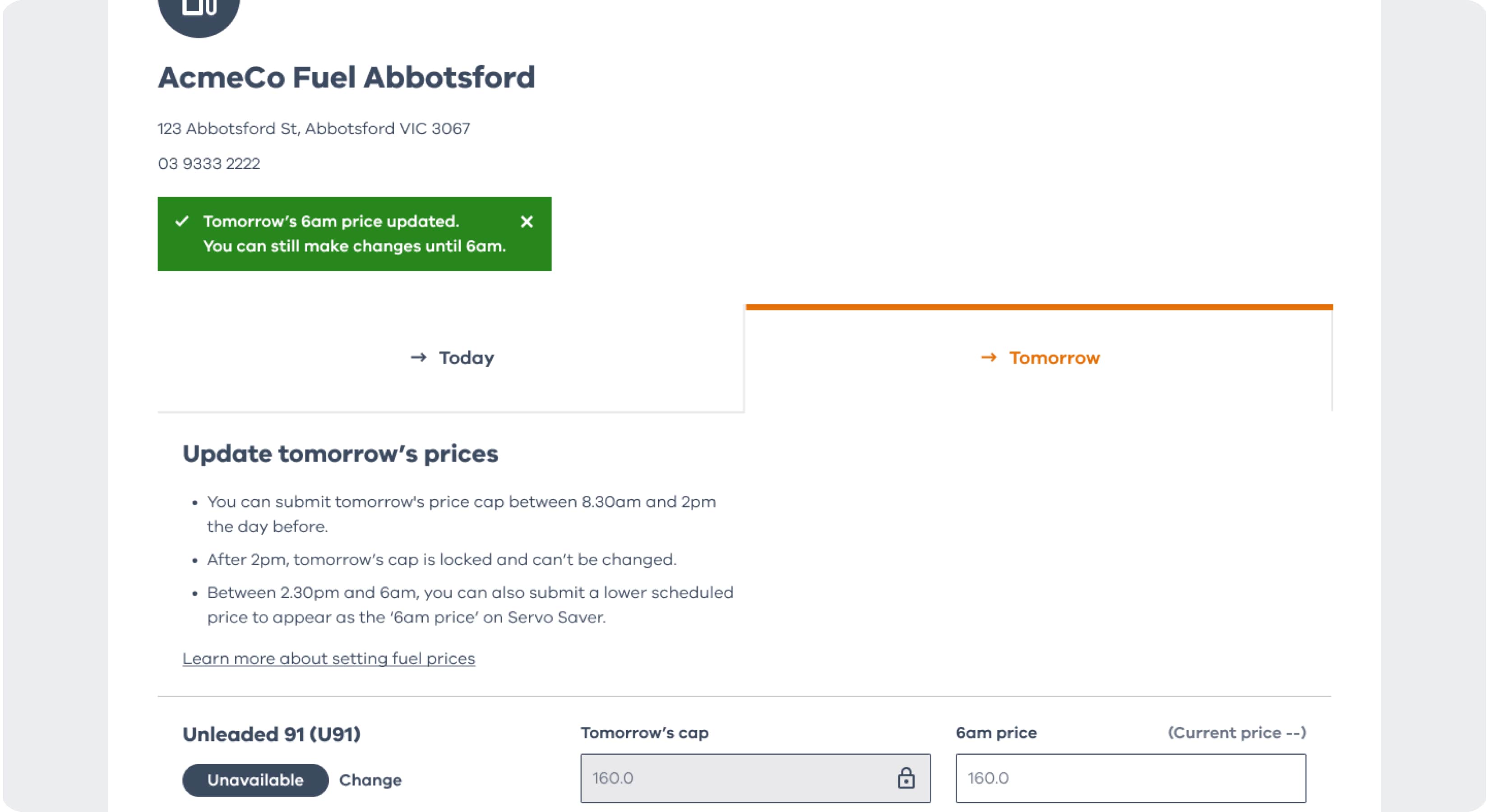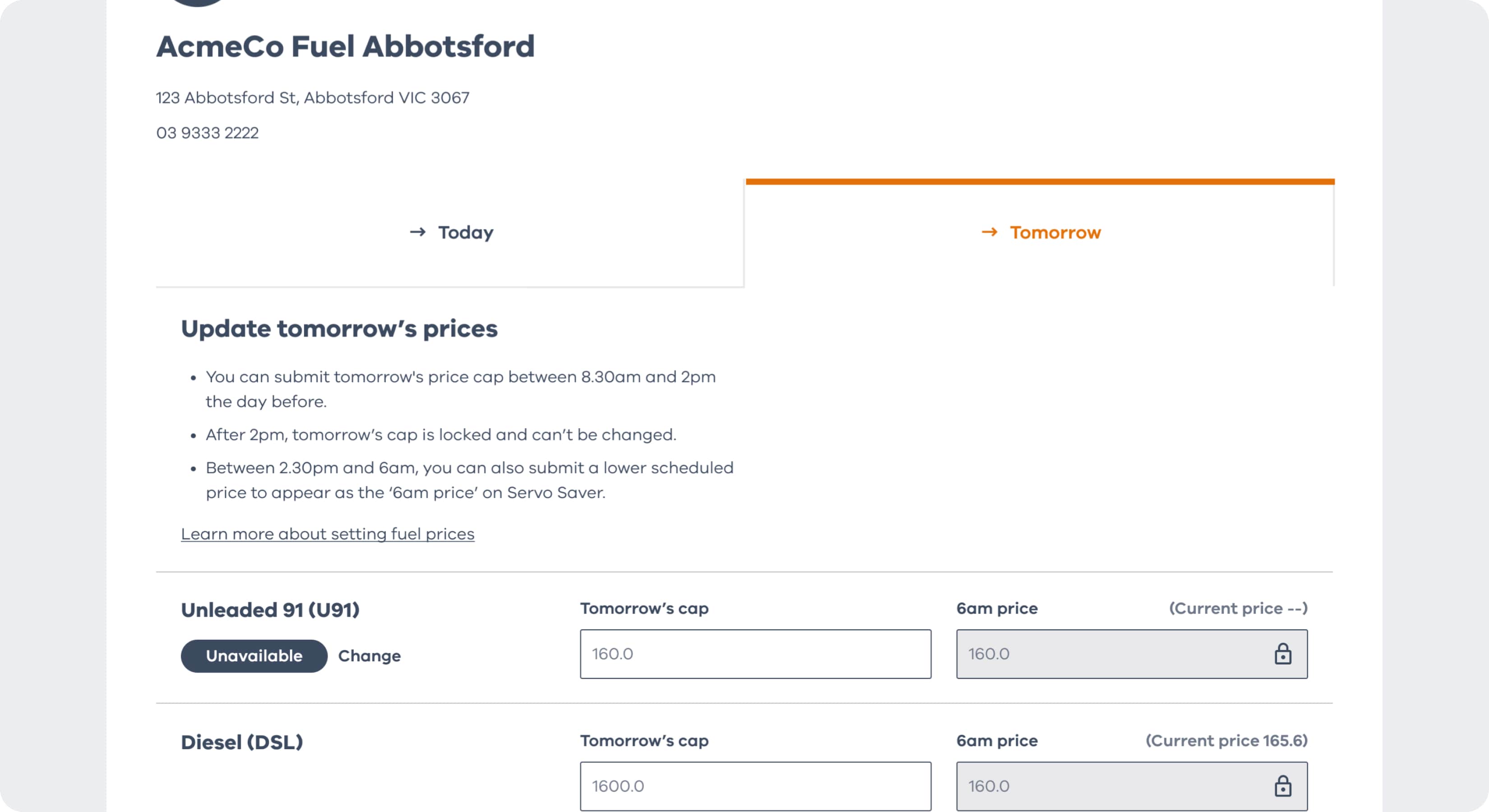 - Between 2.30pm and 6am, you can submit a lower scheduled price to appear as the ‘6am price’ on Servo Saver.