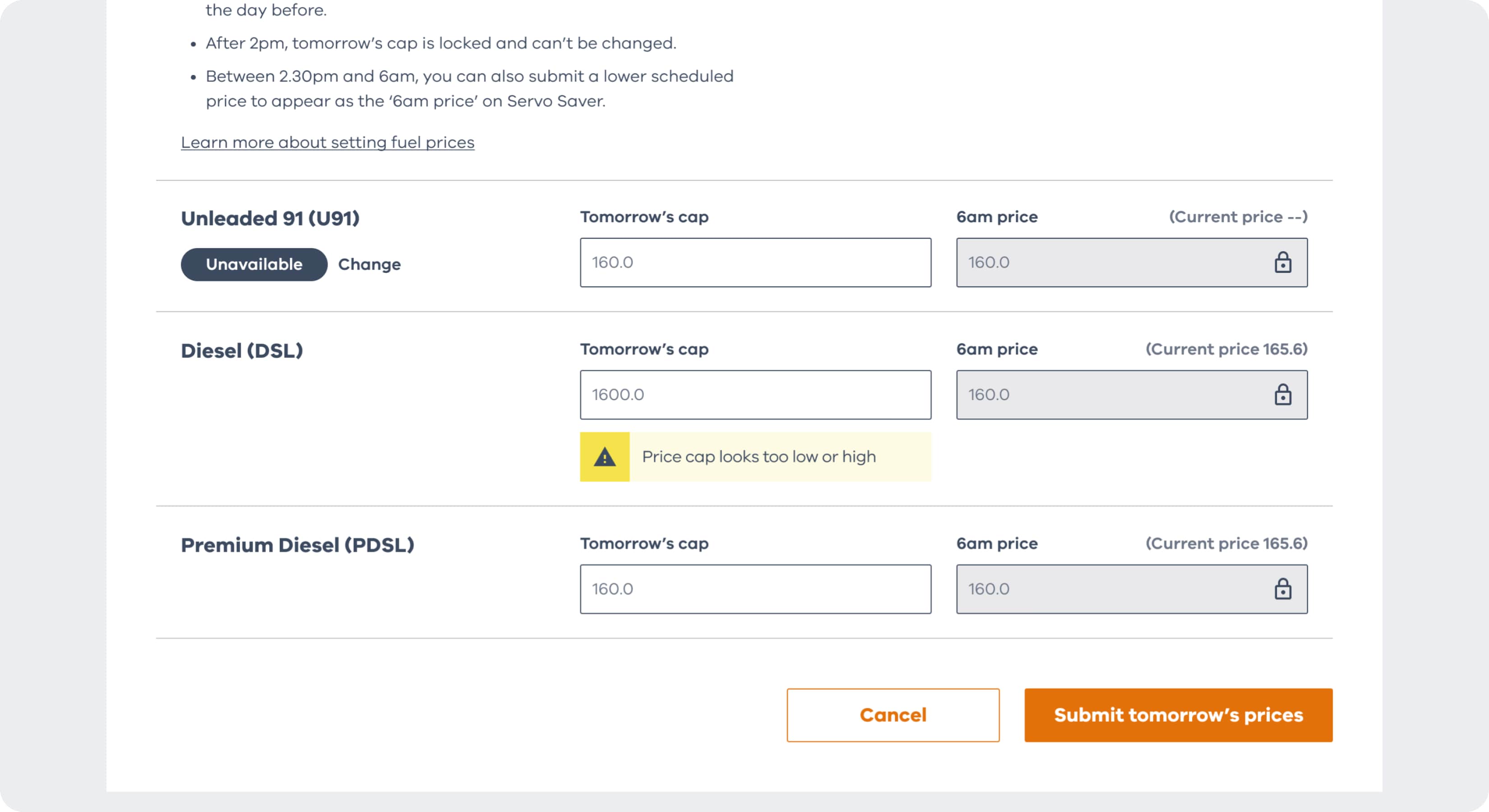 - You can submit tomorrow's price cap between 8.30am and 2pm the day before.
