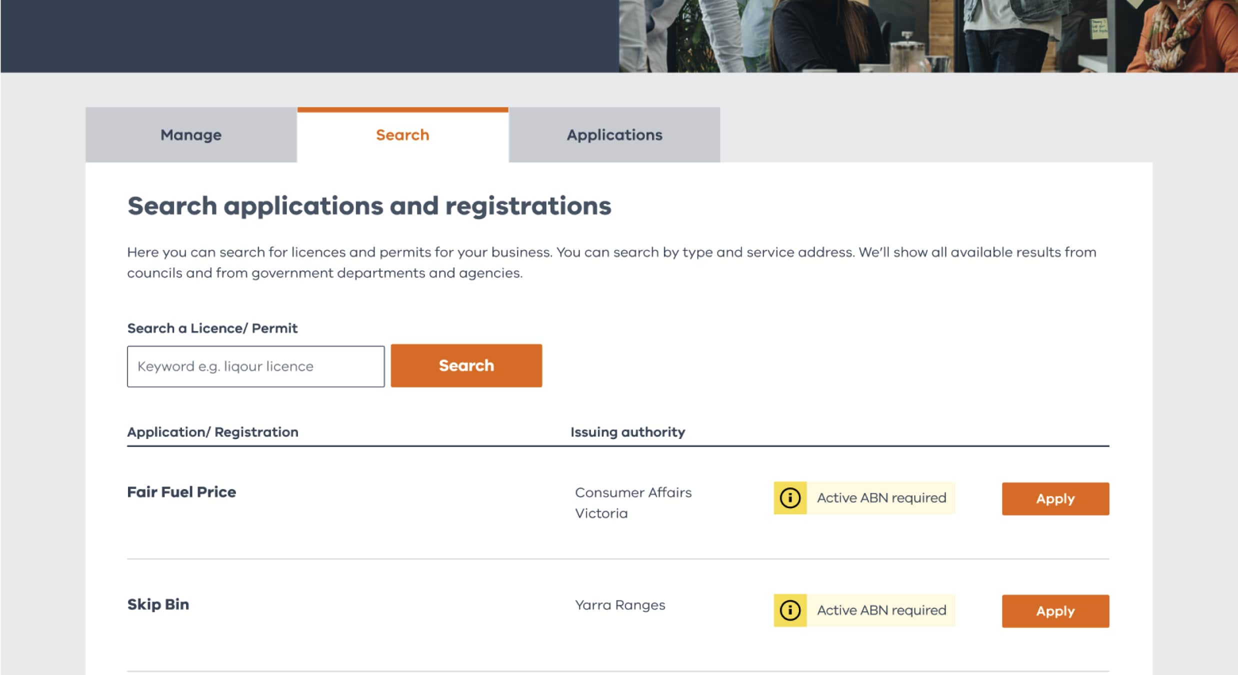 You’re now at the ‘Search applications and registrations’ page. From here, you can find the ‘Register to report fuel prices’ section. Click ‘Apply’ to get started.