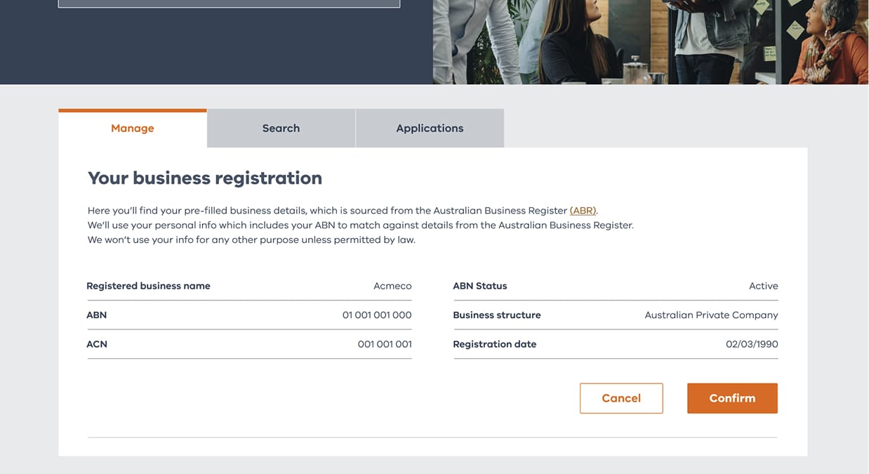 Review the business name, ACN, ABN status, business structure and registration. If they’re correct select ‘Confirm.’ If there’s an issue, contact the Australian Business Register.